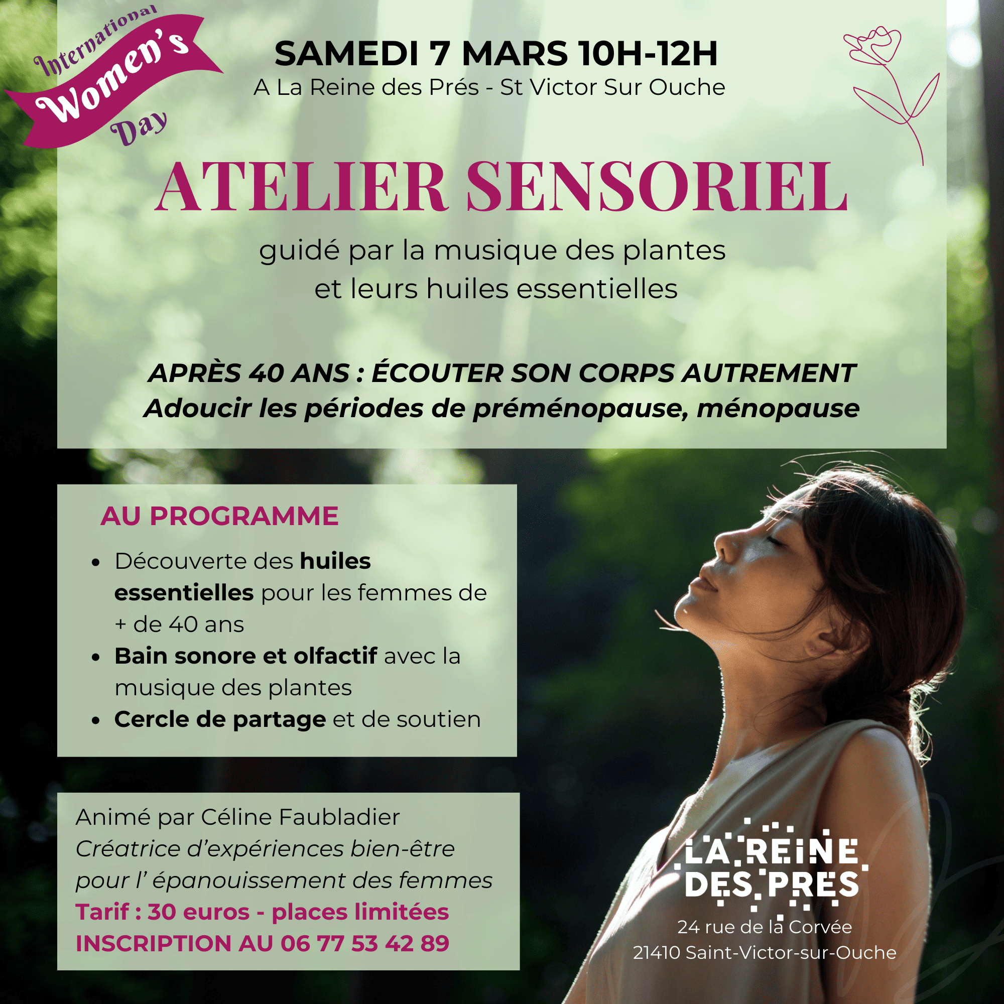 Un atelier proposé le samedi 7 mars 10h-12h à l'espace "La Reine de Prés" à Saint-Victor-sur-Ouche et animé par Céline Faubladier - Ecrin de Gaïa, créatrice d'expériences bien-être pour l'épanouissement des femmes.